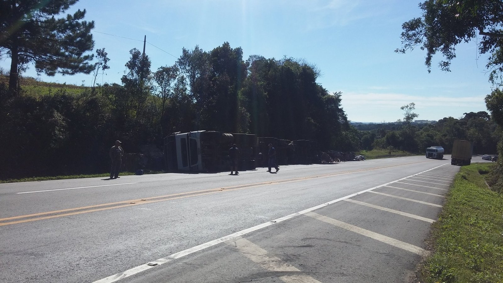 Na manhã deste sábado (06) mais uma carreta tombou próximo da divisa entre as cidades de Contenda e Lapa, na Rodovia do Xisto. Praticamente no mesmo local – um trecho de curva – uma Scania, placa IJI-5937, de Veranópolis, Rio Grande do Sul, tombou no mês passado.