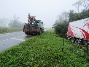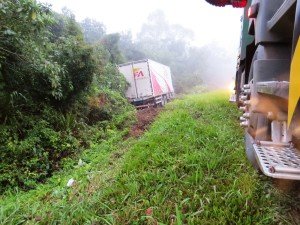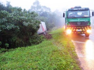 Um caminhoneiro natural de União da Vitória levou um susto por volta das 5h50 desta terça-feira (07), no km 181 da Rodovia do Xisto, entre os municípios de Contenda e Lapa. Ele seguia com destino a Curitiba, viajava desde as 3h da manhã e, depois de fazer uma parada no Posto Mariental, acabou perdendo o controle do Volvo truck, placas AWE-4644, de Dois Vizinhos-PR. A carreta não venceu a curva do local e acabou saindo da pista, mas por sorte não tombou.