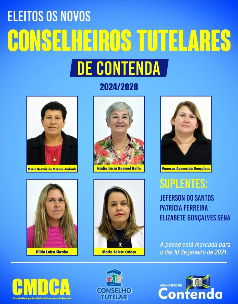 Coordenado pelo Conselho Municipal dos Direitos da Criança e do Adolescente de Contenda, o CMDCA, foram eleitos para o período 2024/2028 os seguintes conselheiros: Maria Beatriz de Moraes Andrade, com 331 votos, Nádia Lucia Baumel Bello (181), Vanessa Aparecida Gonçalves (166), Hilda Luiza Skraba (130) e Maria Salete Colaço, com 67 votos. Jéferson dos Santos, Patrícia Ferreira e Elizabete Gonçalves Sena ficaram como suplentes.