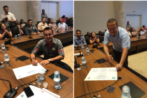Diretos do Colégio Miguel Franco e CEEBJA assinam repasses para reforma. Fotos: reprodução / Facebook