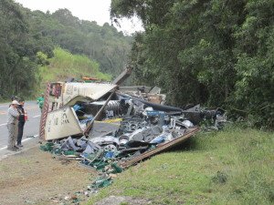 Um homem, uma mulher e uma menina – provavelmente marido, mulher e filha – viajavam sentido Lapa quando o condutor perdeu o controle da direção da Scania 380, placas IQR-9231, de São Luiz Gonzaga, Rio Grande do Sul. A carreta Randon, placa DBC-4917, é de São Bernardo do Campo, São Paulo.