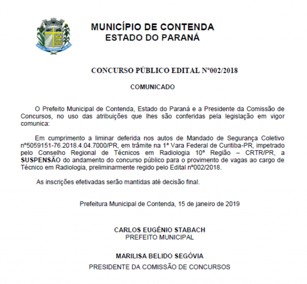Anunciado pela Prefeitura Municipal de Contenda no dia 17 de Dezembro através de postagem na página no Facebook, o Concurso Público de cadastro reserva para o cargo de Técnico em Radiologia (edital n° 002/2018) foi suspenso. A suspensão do certame não foi anunciada explicitamente pela Prefeitura, como na ocasião do lançamento do respectivo, mas o comunicado da suspensão consta na aba Concursos, no site da Administração Municipal.
