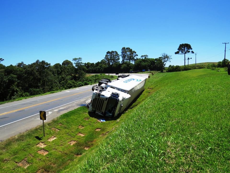 Uma carreta Scania tombou por volta das 14h30 desta quarta-feira (20) no km 180 da Rodovia do Xisto, BR 476, entre os municípios de Contenda e Lapa. O motorista da carreta, com placas do Rio Grande do Sul, perdeu o controle da direção após efetuar a curva fechada existente no local. Felizmente, ele saiu ileso, contabilizando apenas os danos materiais.